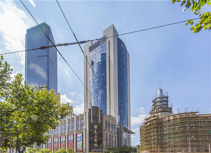 改造前的立面設(shè)計(jì)較為保守,四角石材和中間玻璃形成的幕墻分隔過(guò)于強(qiáng)調(diào)水平線條,不利于凸顯大廈的體量。石材與玻璃的顏色配色平淡,使得整棟建筑在嘉里中心、越洋廣場(chǎng)等超高層塔樓林立的靜安寺地帶顯得灰暗無(wú)生氣,僅能充當(dāng)背景。大廈主入口所在的裙房部位立面簡(jiǎn)單落地,對(duì)出入口沒(méi)有強(qiáng)化。