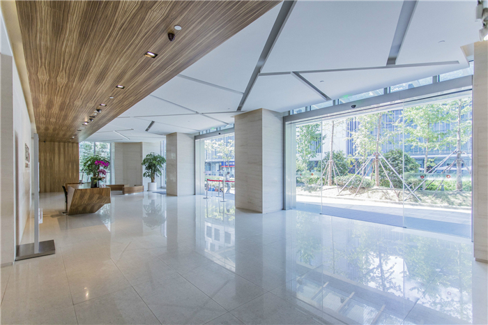 然而,高和資本對(duì)項(xiàng)目進(jìn)行了全新的定位,將其作為進(jìn)軍上海辦公地產(chǎn)的地標(biāo)項(xiàng)目。新的設(shè)計(jì)方案改變了原來(lái)的水平向線條,注重豎向趨勢(shì),并在豎向幕墻框架上設(shè)置玻璃肋強(qiáng)化這一效果。石材和玻璃的配色減少至一種,營(yíng)造出洗練簡(jiǎn)介的立面構(gòu)成。夜間配合照明,極大提升了本項(xiàng)目在靜安寺地區(qū)的存在感。裙樓位置增加了較大尺度的挑檐,重塑和定義入口空間的同時(shí),消減單一體量對(duì)愚園路的壓迫感。裙樓部位,石材的劃分和玻璃的劃分取不同模式,不同材質(zhì)的差異化處理手法,更加強(qiáng)調(diào)和凸顯了入口空間。