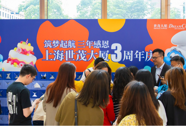 上海世茂大廈喜迎三周年,98%出租率逆勢領(lǐng)跑,藍(lán)精靈公益巡展亮相濱江世茂52+