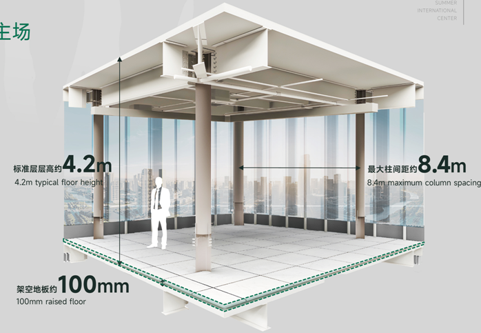 標(biāo)準(zhǔn)層層高約4.2米,空間方正,通透明亮;最大柱間距約8.4米,提升空間使用效率;100毫米架空地板,帶來更多元的空間規(guī)劃。