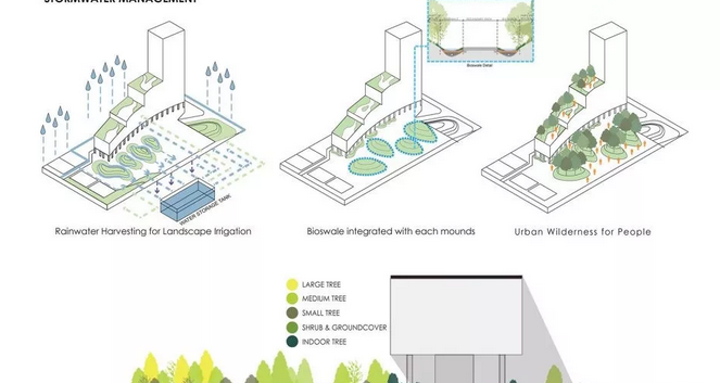 ? ? ? 在雨水管理方面,在每個(gè)土墩的底部產(chǎn)生生物洼地,以有效地調(diào)節(jié)排水模式,同時(shí)允許徑流緩慢地穿過(guò)