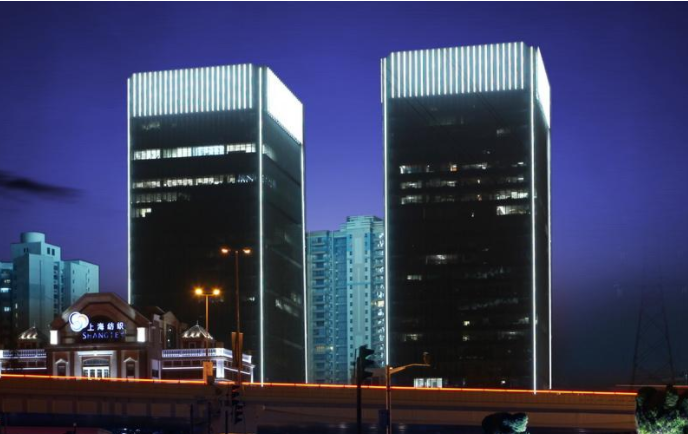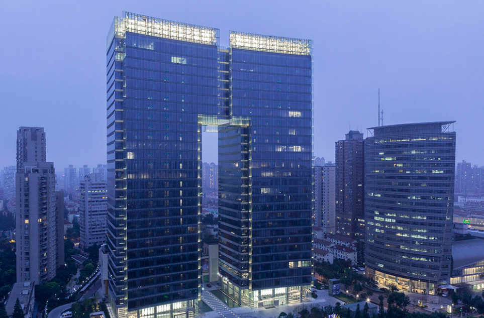 金虹橋國際中心位于上海茅臺路、婁山關(guān)路口,主體建筑是一幢“門”字型甲級辦公樓、一座內(nèi)街式、